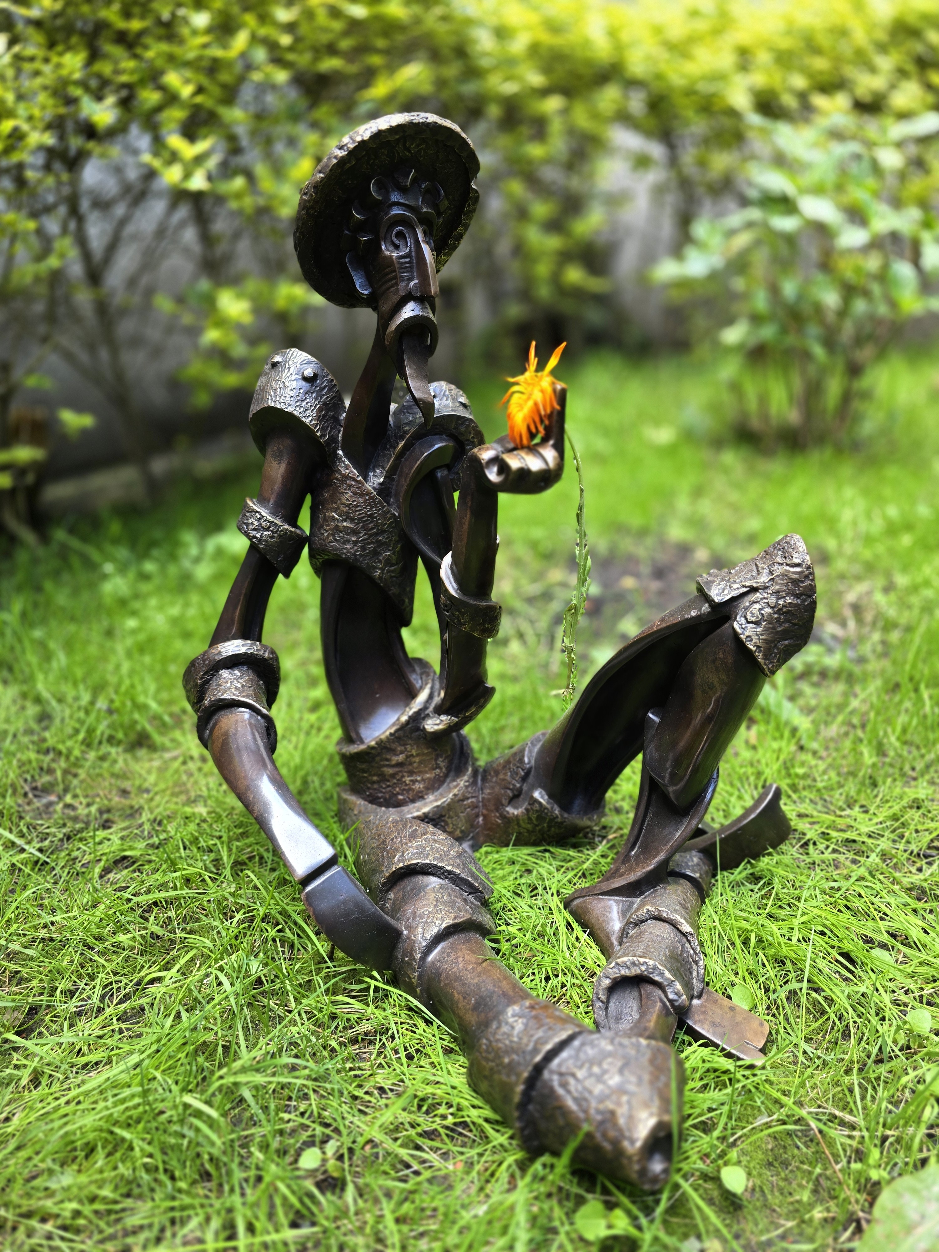 En esta pieza, nos centramos intensamente en el desarrollo de texturas únicas y especializadas para definir la "armadura" del personaje. Nos alejamos de los acabados pulidos y, en su lugar, utilizamos una serie de técnicas de fundición por capas para crear una superficie rugosa, martillada y desgastada que evoca toda una vida de vagabundeo bajo el sol español. La modificación de su forma —alargada, curvada y sentada en un momento de tranquila reflexión— crea un poderoso contraste con la pesada y táctil pesadez del bronce. Al colocar una delicada y vibrante flor en su mano, resaltamos la dualidad de la escultura: la "protección" dura e inquebrantable de la armadura frente al suave idealismo del alma que la habita. Este proyecto demuestra nuestra capacidad para tomar una figura histórica reconocible y transformarla en un estudio contemporáneo de la superficie, el alma y la metalistería.